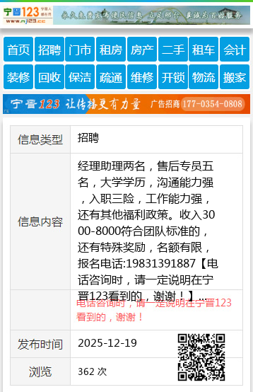 经理助理两名,售后专员五名,大学学历,沟通能力强,入职三险,工作能力强,还有其他福利政策。收入3000-8000符合团队标准的,还有特殊奖励,名额有限,报名电话:19831391887 【电话咨询时,请一定说明在宁晋123看到的,谢谢!】 |