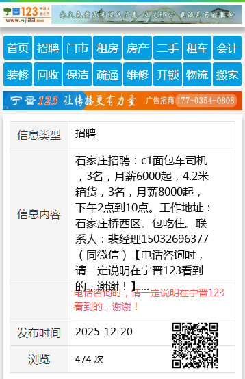 石家庄招聘:c1面包车司机,3名,月薪6000起,4.2米箱货,3名,月薪8000起,下午2点到10点。工作地址:石家庄桥西区。包吃住。联系人:裴经理15032696377(同微信) 【电话咨询时,请一定说明在宁晋123看到的,谢谢!】 |