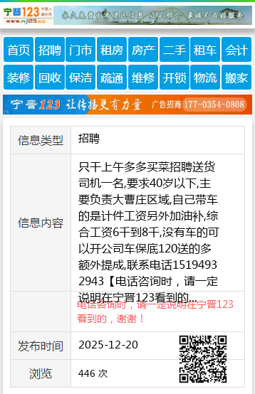 只干上午多多买菜招聘送货司机一名,要求40岁以下,主要负责大曹庄区域,自己带车的是计件工资另外加油补,综合工资6千到8千,没有车的可以开公司车保底120送的多额外提成,联系电话15194932943 【电话咨询时,请一定说明在宁晋123看到的,谢谢!】 |