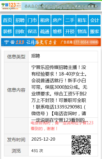 宁晋乐迎传媒招聘主播!没有经验要求!18-40岁女士。会说普通话就行!新手小白可带。保底3000加分成。无业绩要求。综合工资5千到2万上不封顶!可兼职可全职!联系电话13393290981(微信号) 【电话咨询时,请一定说明在宁晋123看到的,谢谢!】 |