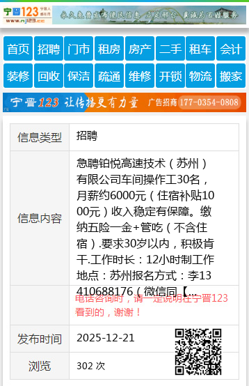 急聘铂悦高速技术(苏州)有限公司车间操作工30名,月薪约6000元(住宿补贴1000元)收入稳定有保障。缴纳五险一金+管吃(不含住宿).要求30岁以内,积极肯干.工作时长:12小时制工作地点:苏州报名方式:李13410688176(微信同 【电话咨询时,请一定说明在宁晋123看到的,谢谢!】 |