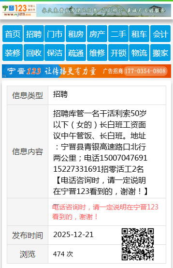 招聘库管一名干活利索50岁以下(女的)长白班工资面议中午管饭、长白班。地址:宁晋县青银高速路口北行两公里;电话1500704769115227331691招零活工2名 【电话咨询时,请一定说明在宁晋123看到的,谢谢!】 |