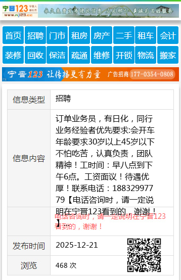 订单业务员,有日化,同行业务经验者优先要求:会开车年龄要求30岁以上45岁以下不怕吃苦,认真负责,团队精神!工时间:早八点到下午6点。工资面议!待遇优厚!联系电话:18832997779 【电话咨询时,请一定说明在宁晋123看到的,谢谢!】 |