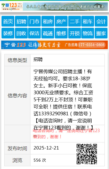 宁晋传媒公司招聘主播!有无经验均可。要求18-38岁女士。新手小白可教!保底3000无业绩要求。综合工资5千到2万上不封顶!可兼职可全职!提供住宿!联系电话13393290981(微信号) 【电话咨询时,请一定说明在宁晋123看到的,谢谢!】 |