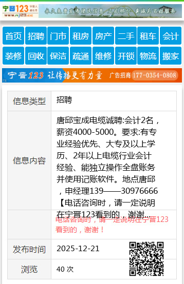唐邱宝成电缆诚聘:会计2名,薪资4000-5000。要求:有专业经验优先、大专及以上学历、2年以上电缆行业会计经验、能独立操作全盘账务并使用记账软件。地点唐邱,申经理139——30976666 【电话咨询时,请一定说明在宁晋123看到的,谢谢!】 |