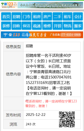 招聘库管一名干活利索40岁以下(女的)长白班工资面议中午管饭、长白班。地址:宁晋县青银高速路口北行两公里;电话1500704769115227331691招零活工2名 【电话咨询时,请一定说明在宁晋123看到的,谢谢!】 |