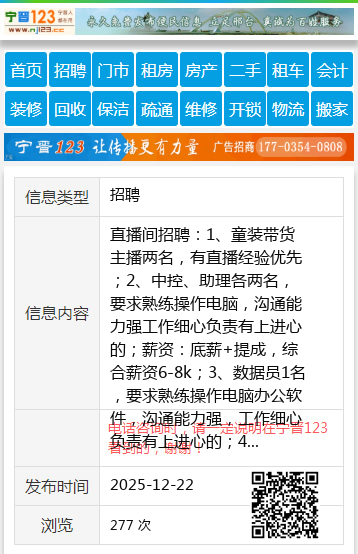 直播间招聘:1、童装带货主播两名,有直播经验优先;2、中控、助理各两名,要求熟练操作电脑,沟通能力强工作细心负责有上进心的;薪资:底薪+提成,综合薪资6-8k;3、数据员1名,要求熟练操作电脑办公软件,沟通能力强,工作细心负责有上进心的;4、网店美工1名,要求能熟练操作办公软件+PS,有摄影经验优先;5、会计两名,要求:有两年以上会计经验,有电商经验优先;6、选品员两名,熟练电脑办公软件,沟通能力强,有销售经验优先;7、招聘网店客服3名,要求:可以接受早晚班,熟练使用电脑,打字快,有相关工作经验一年以上,对工作认真负责;工作地点:宁晋六中附近,联系电话:15931951171(微信同号) 【电话咨询时,请一定说明在宁晋123看到的,谢谢!】 |