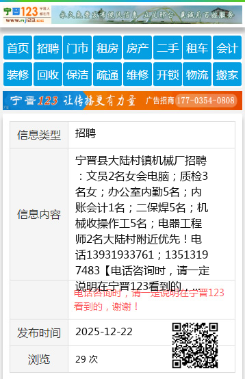 宁晋县大陆村镇机械厂招聘:文员2名女会电脑;质检3名女;办公室内勤5名;内账会计1名;二保焊5名;机械收操作工5名;电器工程师2名大陆村附近优先!电话13931933761;13513197483 【电话咨询时,请一定说明在宁晋123看到的,谢谢!】 |