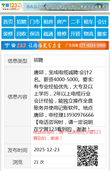 唐邱,宝成电缆诚聘:会计2名。薪资4000-5000。要求:有专业经验优先,大专及以上学历,2年以上电缆行业会计经验,能独立操作全盘账务并使用记账软件。地点唐邱,申经理13930976666 【电话咨询时,请一定说明在宁晋123看到的,谢谢!】 |