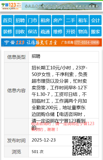 招长期工10元/小时,23岁-50岁女性,干净利索,负责超市理货以及分装,忙时卖卖货等,工作时间早8-12下午1.30-7,工资可日结,不招临时工,工作满两个月加全勤奖200元,地址童泰东边团购仓储 【电话咨询时,请一定说明在宁晋123看到的,谢谢!】 |