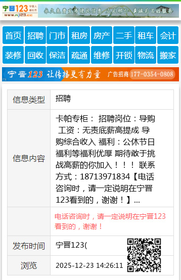 卡帕专柜: 招聘岗位:导购 工资:无责底薪高提成 导购综合收入 福利:公休节日福利等福利优厚 期待敢于挑战高薪的你加入!!! 联系方式:18713971834 【电话咨询时,请一定说明在宁晋123看到的,谢谢!】 |