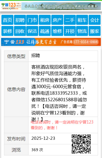 客林酒店现招收银员两名,形象好气质佳沟通能力强,有工作经验者优先,薪资待遇3000元-6000元管食宿,联系电话18333952333,或者微信15226801588非诚勿扰! 【电话咨询时,请一定说明在宁晋123看到的,谢谢!】 |