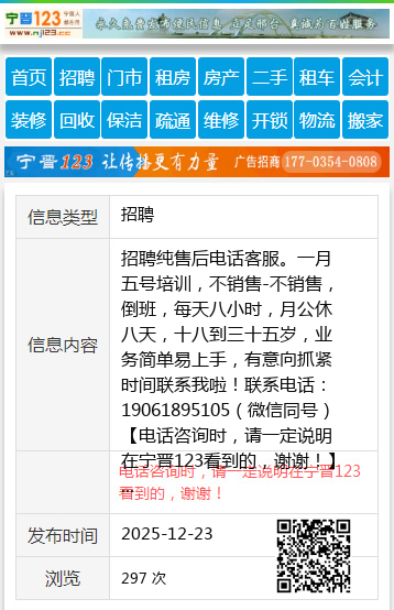 招聘纯售后电话客服。一月五号培训,不销售-不销售,倒班,每天八小时,月公休八天,十八到三十五岁,业务简单易上手,有意向抓紧时间联系我啦!联系电话:19061895105(微信同号) 【电话咨询时,请一定说明在宁晋123看到的,谢谢!】 |