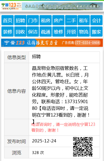 晶龙物业急招宿管数名,工作地点:黄儿营。长白班,月公休四天。管吃住。女,年龄50周岁以内,初中以上文化程度。形象好,能吃苦耐劳。联系电话:13731590180 【电话咨询时,请一定说明在宁晋123看到的,谢谢!】 |