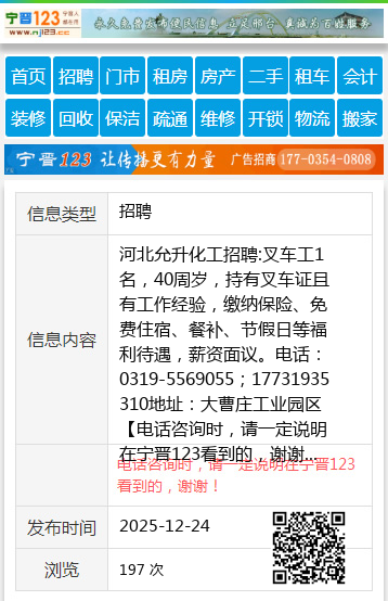| 防骗提醒: | 宁晋123(www.nj123.cc)提醒您:手工活、网络兼职、刷单,都是骗子!凡以各种名义收取费用的都是骗子!找工作是往兜里挣钱,让你往外掏钱的都是骗子!异地招聘请提高警惕,谨防诈骗! |