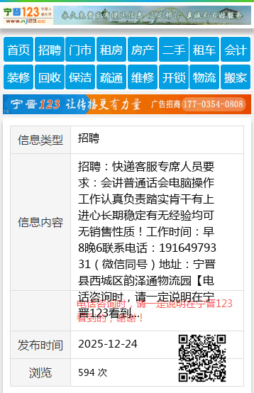 招聘:快递客服专席人员要求:会讲普通话会电脑操作工作认真负责踏实肯干有上进心长期稳定有无经验均可无销售性质!工作时间:早8晚6联系电话:19164979331(微信同号)地址:宁晋县西城区韵泽通物流园 【电话咨询时,请一定说明在宁晋123看到的,谢谢!】 |