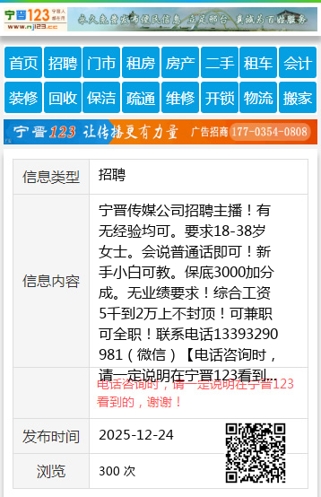 宁晋传媒公司招聘主播!有无经验均可。要求18-38岁女士。会说普通话即可!新手小白可教。保底3000加分成。无业绩要求!综合工资5千到2万上不封顶!可兼职可全职!联系电话13393290981(微信) 【电话咨询时,请一定说明在宁晋123看到的,谢谢!】 |