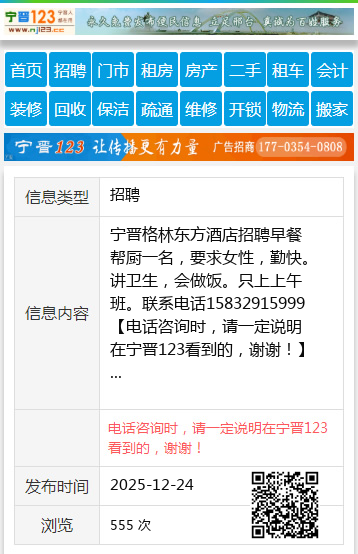 宁晋格林东方酒店招聘早餐帮厨一名,要求女性,勤快。讲卫生,会做饭。只上上午班。联系电话15832915999
