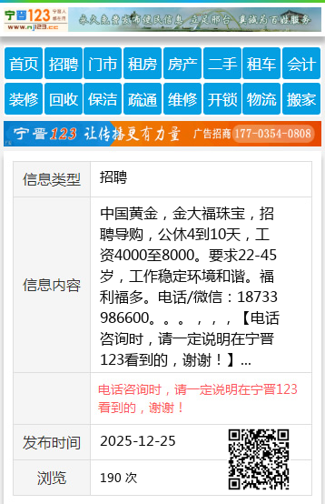 中国黄金,金大福珠宝,招聘导购,公休4到10天,工资4000至8000。要求22-45岁,工作稳定环境和谐。福利福多。电话/微信:18733986600。。。,,, 【电话咨询时,请一定说明在宁晋123看到的,谢谢!】 |
