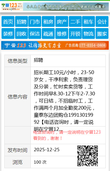 招长期工10元/小时,23-50岁女,干净利索,负责理货及分装,忙时卖卖货等,工作时间早8.30-12下午2-7.30,可日结,不招临时工,工作满两个月加全勤奖200元,童泰东边团购仓19913019992 【电话咨询时,请一定说明在宁晋123看到的,谢谢!】 |
