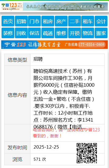 聘铂悦高速技术(苏州)有限公司车间操作工30名,月薪约6000元(住宿补贴1000元)收入稳定有保障。缴纳五险一金+管吃(不含住宿).要求30岁以内,积极肯干.工作时长:12小时制工作地点:苏州报名方式:李13410688176(微信 【电话咨询时,请一定说明在宁晋123看到的,谢谢!】 |