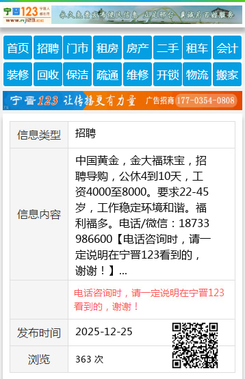 中国黄金,金大福珠宝,招聘导购,公休4到10天,工资4000至8000。要求22-45岁,工作稳定环境和谐。福利福多。电话/微信:18733986600 【电话咨询时,请一定说明在宁晋123看到的,谢谢!】 |