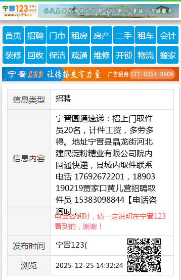 宁晋圆通速递:招上门取件员20名,计件工资,多劳多得。