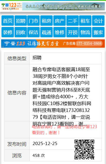 融合专席电话客服满18周至38周岁男女不限8个小时针对高端用户高效解决客户问题无强制营销月休6至8天底薪+提成综合4000+,方大科技园C10栋2楼智联创科网络科技有意电联17320813279 【电话咨询时,请一定说明在宁晋123看到的,谢谢!】 |