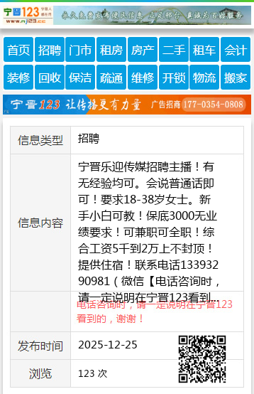 宁晋乐迎传媒招聘主播!有无经验均可。会说普通话即可!要求18-38岁女士。新手小白可教!保底3000无业绩要求!可兼职可全职!综合工资5千到2万上不封顶!提供住宿!联系电话13393290981(微信 【电话咨询时,请一定说明在宁晋123看到的,谢谢!】 |