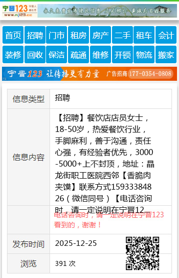 【招聘】餐饮店店员女士,18-50岁,热爱餐饮行业,手脚麻利,善于沟通,责任心强,有经验者优先,3000-5000+上不封顶,地址:晶龙街职工医院西邻【香脆肉夹馍】联系方式15933384826(微信同号) 【电话咨询时,请一定说明在宁晋123看到的,谢谢!】 |