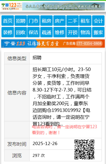 招长期工10元/小时。23-50岁女,干净利索,负责理货分装,卖货等,工作时间早8.30-12下午2-7.30,可日结,不招临时工,工作满两个月加全勤奖200元,童泰东边团购仓19913019992 【电话咨询时,请一定说明在宁晋123看到的,谢谢!】 |