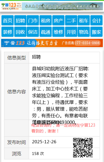 县城妇幼院附近液压厂招聘:液压阀实验台测试工(要求有液压行业经验),平面磨床工,加工中心技术工(要求能独立编程,工作经验三年以上),待遇优厚,要求:男,服从管理,能吃苦耐劳,有责任心。有意者电联范经理15690493000。