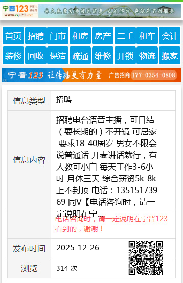 招聘电台语音主播,可日结(要长期的)不开镜 可居家 要求18-40周岁 男女不限会说普通话 开麦讲话就行,有人教可小白 每天工作3-6小时 月休三天 综合薪资5k-8k上不封顶 电话:13515173969 同V 【电话咨询时,请一定说明在宁晋123看到的,谢谢!】 |