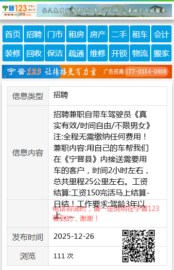 招聘兼职自带车驾驶员《真实有效/时间自由/不限男女》注:全程无需缴纳任何费用!兼职内容:用自己的车帮我们在《宁晋县》内接送需要用车的客户,时间2小时左右,总共里程25公里左右。工资结算:工资150完活马上结算-日结!工作要求:驾龄3年以上,车龄8年以内,限邢台市车牌私家车:轿车,越野车,商务车均可。注:冀E冀A车牌能做的加微信:DD522039或致电:15716993650 【电话咨询时,请一定说明在宁晋123看到的,谢谢!】 |