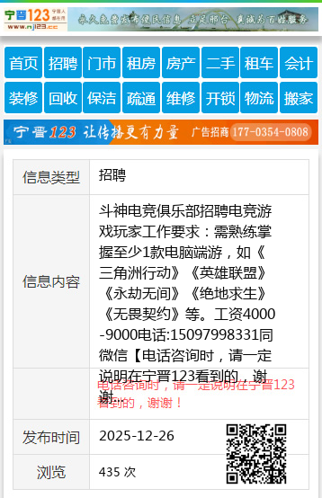 斗神电竞俱乐部招聘电竞游戏玩家工作要求:需熟练掌握至少1款电脑端游,如《三角洲行动》《英雄联盟》《永劫无间》《绝地求生》《无畏契约》等。工资4000-9000电话:15097998331同微信 【电话咨询时,请一定说明在宁晋123看到的,谢谢!】 |