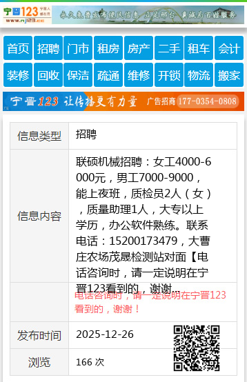 联硕机械招聘:女工4000-6000元,男工7000-9000,能上夜班,质检员2人(女),质量助理1人,大专以上学历,办公软件熟练。联系电话:15200173479,大曹庄农场茂晟检测站对面 【电话咨询时,请一定说明在宁晋123看到的,谢谢!】 |