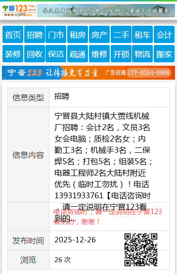 宁晋县大陆村镇大贾线机械厂招聘:会计2名,文员3名女会电脑;质检2名女;内勤工3名;机械手3名,二保焊5名;打包5名;组装5名;电器工程师2名大陆村附近优先(临时工勿扰)!电话13931933761 【电话咨询时,请一定说明在宁晋123看到的,谢谢!】 |