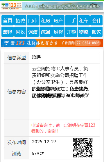 云空间招聘:1:人事专员,负责组织和实施公司招聘工作(办公室卫生),具备良好的沟通协调能力,女士优先。