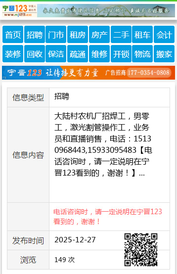 大陆村农机厂招焊工,男零工,激光割管操作工,业务员和直播销售,电话:15130968443,15933095483 【电话咨询时,请一定说明在宁晋123看到的,谢谢!】 |