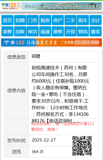 铂悦高速技术(苏州)有限公司车间操作工30名,月薪约6000元(住宿补贴1000元)收入稳定有保障。缴纳五险一金+管吃(不含住宿).要求30岁以内,积极肯干.工作时长:12小时制工作地点:苏州报名方式:李13410688176 【电话咨询时,请一定说明在宁晋123看到的,谢谢!】 |