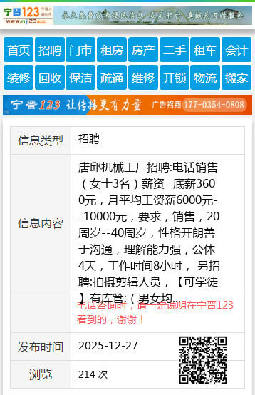 唐邱机械工厂招聘:电话销售(女士3名)薪资=底薪3600元,月平均工资薪6000元--10000元,要求,销售,20周岁--40周岁,性格开朗善于沟通,理解能力强,公休4天,工作时间8小时, 另招聘:拍摄剪辑人员,【可学徒】有库管:(男女均可)工资=3000--5000,经验者优先,工资面议,工作时间8小时,公休4天,法定节假日都放假。 工作地址:唐邱南环路,电话:15612989507 【电话咨询时,请一定说明在宁晋123看到的,谢谢!】 |