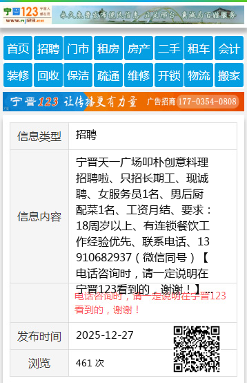 宁晋天一广场叩朴创意料理招聘啦、只招长期工、现诚聘、女服务员1名、男后厨配菜1名、工资月结、要求:18周岁以上、有连锁餐饮工作经验优先、联系电话、13910682937(微信同号) 【电话咨询时,请一定说明在宁晋123看到的,谢谢!】 |