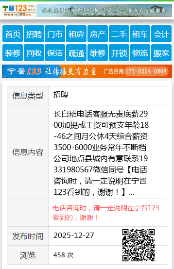 | 防骗提醒: | 宁晋123(www.nj123.cc)提醒您:手工活、网络兼职、刷单,都是骗子!凡以各种名义收取费用的都是骗子!找工作是往兜里挣钱,让你往外掏钱的都是骗子!异地招聘请提高警惕,谨防诈骗! |