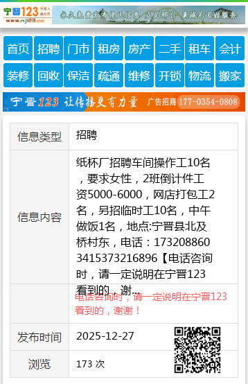 纸杯厂招聘车间操作工10名,要求女性,2班倒计件工资5000-6000,网店打包工2名,另招临时工10名,中午做饭1名,地点:宁晋县北及桥村东,电话:1732088603415373216896 【电话咨询时,请一定说明在宁晋123看到的,谢谢!】 |