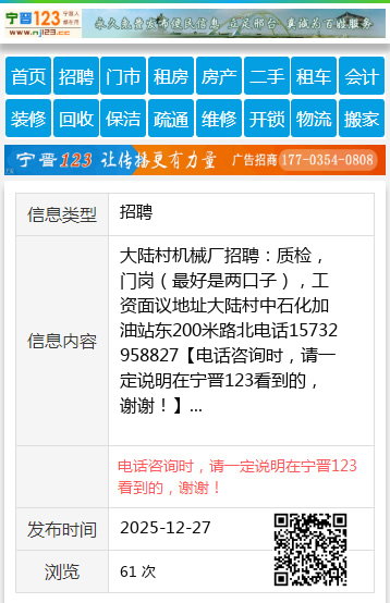 大陆村机械厂招聘:质检,门岗(最好是两口子),工资面议地址大陆村中石化加油站东200米路北电话15732958827 【电话咨询时,请一定说明在宁晋123看到的,谢谢!】 |