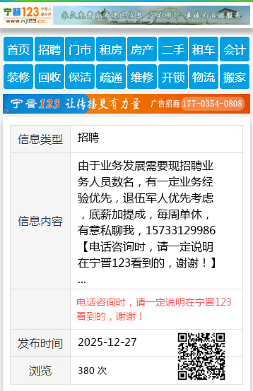 由于业务发展需要现招聘业务人员数名,有一定业务经验优先,退伍军人优先考虑,底薪加提成,每周单休,有意私聊我,15733129986 【电话咨询时,请一定说明在宁晋123看到的,谢谢!】 |