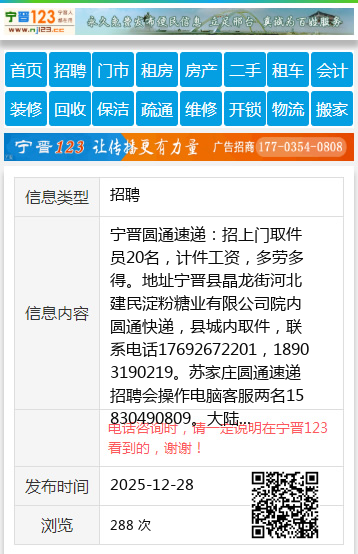 宁晋圆通速递:招上门取件员20名,计件工资,多劳多得。地址宁晋县晶龙街河北建民淀粉糖业有限公司院内圆通快递,县城内取件,联系电话17692672201,18903190219。苏家庄圆通速递招聘会操作电脑客服两名15830490809。大陆村镇招聘取件员五名,要求会骑电车计件提成,一天预计150元,至300元17832295576 【电话咨询时,请一定说明在宁晋123看到的,谢谢!】 |
