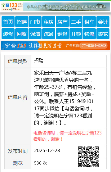 家乐园天一广场A栋二层九速男装招聘优秀导购一名,年龄25-37岁,有销售经验,两班倒,底薪+提成+奖励+公休。联系人王15194910117同步微信 【电话咨询时,请一定说明在宁晋123看到的,谢谢!】 |