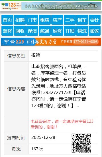 电商招客服两名,打单员一名,库存整理一名,打包员数名临时勿扰,有经验者优先录用,地址方大西临电话联系13932727173!!