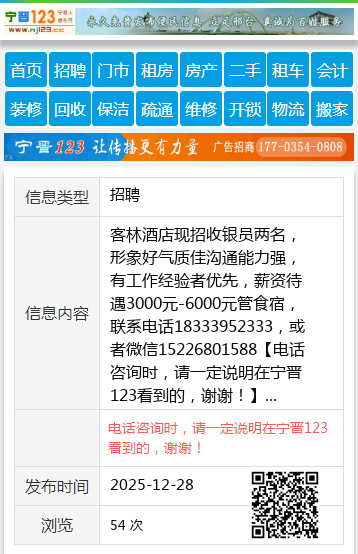 客林酒店现招收银员两名,形象好气质佳沟通能力强,有工作经验者优先,薪资待遇3000元-6000元管食宿,联系电话18333952333,或者微信15226801588 【电话咨询时,请一定说明在宁晋123看到的,谢谢!】 |